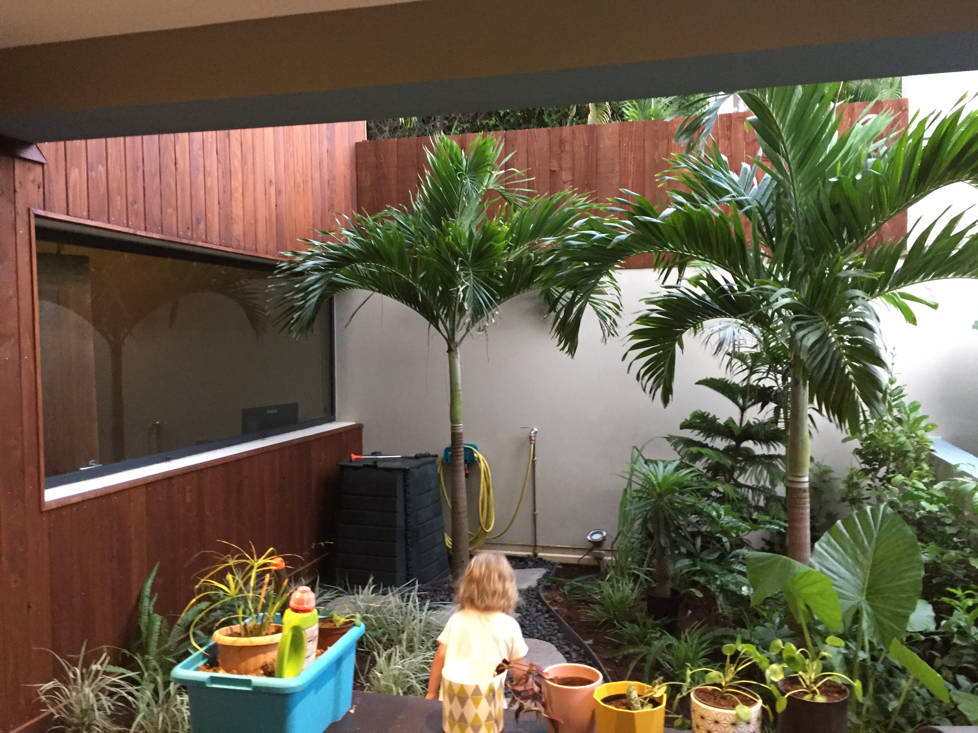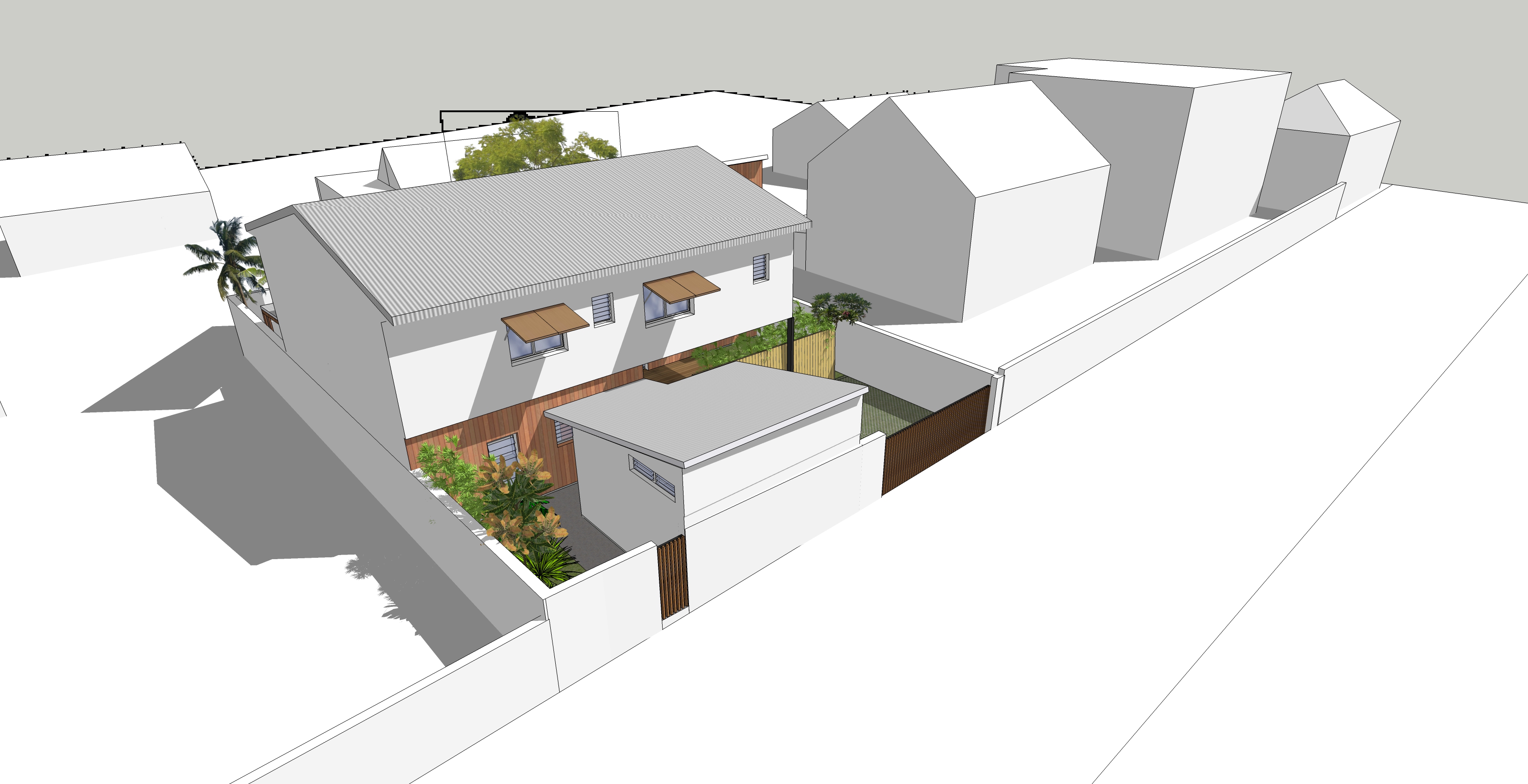 Dès l’instant où l’on passe le mur de séparation de la rue par le portillon piéton, et que l’on contourne le petit appentis de rangement et de bricolage, on se retrouve au sein d’un patio baigné des ombres provenant des façades et de la végétation luxuriante. Ces espaces accueillent et fonctionnent comme un filtre acoustique, une transition du bruit vers la quiétude, avant d’accéder aux pièces à vivre. La cuisine et le séjour s’ouvrent généreusement vers ces espaces extérieurs, notamment vers l’arrière du terrain, laissant la place entière à un jardin tropical, à la fois ombragé et rafraîchissant grâce aux courants d’air qui traversent tout ces espaces ouverts. Une piscine et une grande terrasse en bois font face au salon en Rez de chaussée, au dessus duquel se trouve une mezzanine et un filet de hamac. Toujours dans ce même esprit de bercement, de détente, de maison protectrice des nuisances de la ville, et des aléas climatiques.
